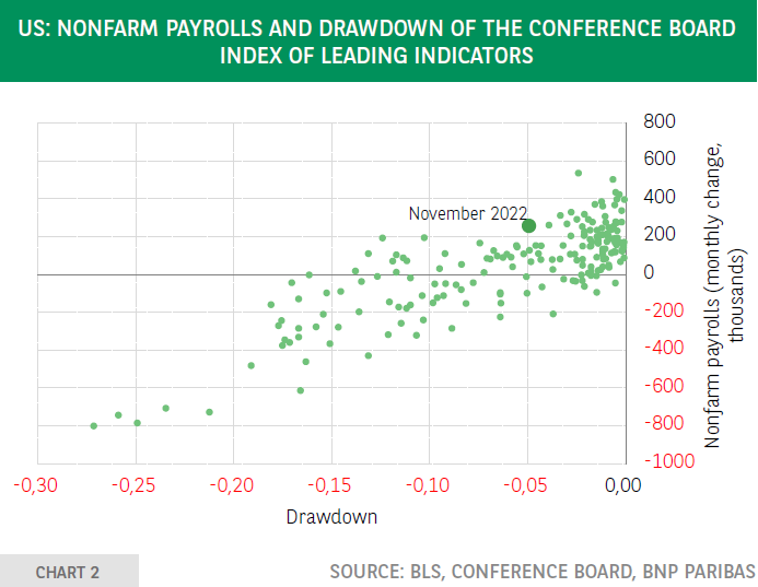 世界大型企业联合会(Conference Board)的指数与就业创造之间的历史相关性,可以让我们对此有所了解。图表2显示了领先指标指数(自历史峰值以来百分比下降)与月度非农就业人数之间的关係。如果前者在未来几个月继续下降,基于过去的关係,人们应该预计每月创造就业的速度将进一步放缓。